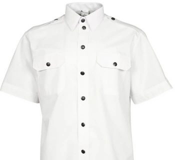 Koszula wyjściowa z krótkim rękawem w kolorze białym z metalowymi, oksydowanymi guzikami. Koszula posiada dwie kieszenie z przodu z patkami oraz na ramionach białe pagony zapinane na guziki. Koszula strażacka, koszula strażacka długi rękaw, koszula męska OSP i oksydowane guziki – w asortymencie SUPRON 1 znajdziecie niezbędne umundurowanie dla OSP.