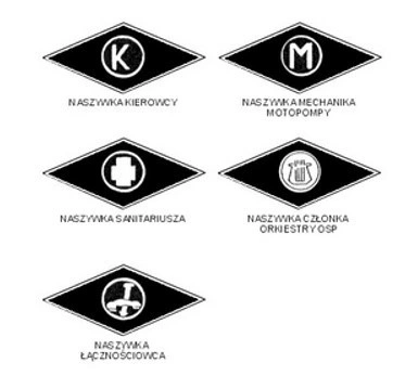 Naszywki i emblematy strażackie wykonane z najwyższą dokładnością - oznaki specjalności haftowane srebrną nitką na ciemnogranatowym tle, przeznaczone dla członków OSP i zarządów ZOSP RP, pełniących funkcje kierowców, mechaników motopomp, łącznościowców, a także członków orkiestr i drużyn sanitarnych. Umieszczane przy mundurach wyjściowych i galowych na ich lewym rękawie.