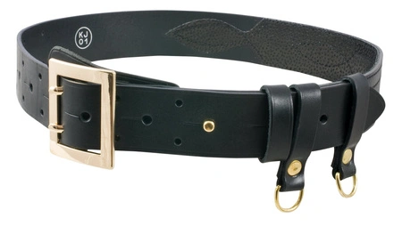 Pas oficerski wykonany jest ze skóry barwionej na czarno zakończony metalową sprzączką. Na pas założona jest ruchoma przesuwka. Klamra oraz częsci metalowe pasa oficerskiego wykonane są ze złotego błyszczącego metalu. Pas w komplecie posiada dwie bojówki.
