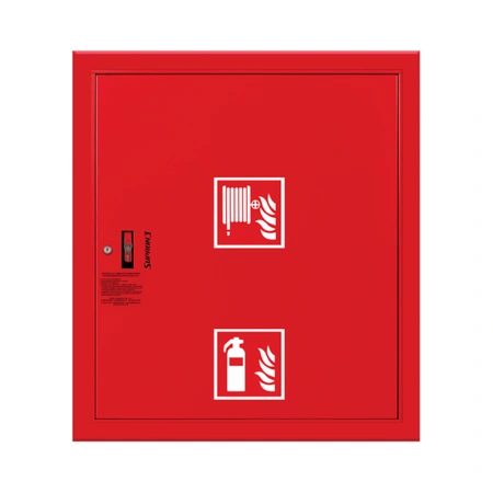 - szafka hydrantowa STANDARD wykonana z blachy czarnej malowanej w kolorze czerwonym (RAL 3000) lub białym (RAL 9003), drzwi pełne; dzięki zastosowaniu zawiasu krytego drzwi szafki można otworzyć o 180º