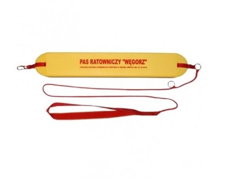 WĘGORZ II. Składa się z elastycznego, nietonącego podłużnego pływaka wraz z szelką ratowniczą i linką. Stosowany przy indywidualnych akcjach ratunkowych na wodach otwartych. Opinamy pasem ratowanego i holujemy. Jeżeli ratowany jest przytomny, możemy pas podać lub rzucić. Zgodny z parametrami pasa ILS. BARWA ŻÓŁTA.