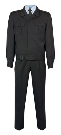 Mundur służbowy męski składa się z bluzy olimpijki i spodni. Bluza jednorzędowa zapinana jest na pięć guzików krytych listwą. Kołnierz i wyłogi są wykładane. Z kolei tył bluzy jest dwuczęściowy ze szwem pośrodku, stebnowanym podwójnie. Na częściach przodów naszyte są dwie górne kieszenie z fałdkami, nakryte klapkami, zapinane na jeden guzik. Na szwach barkowych przypięte są naramienniki.