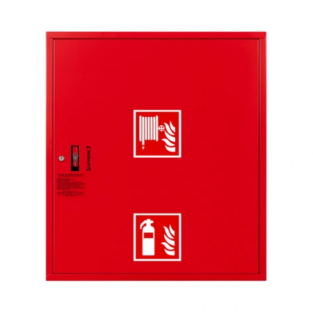 - Hydrant wewnętrzny DN25 zawieszany z wężem półsztywnym 25mm z miejscem na gaśnicę pod zwijadłem. Wersja uniwersalna: możliwość podłączenia tego samego hydrantu w wykonaniu lewym lub prawym. Otwory przyłączeniowe są zaślepione i umożliwiają podłączenie do