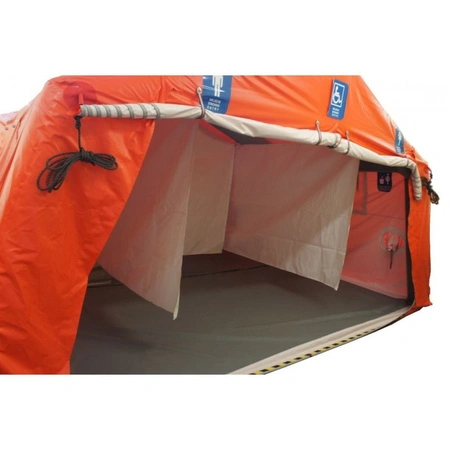 Namiot pneumatyczny dekontaminacyjny ma konstrukcję opartą na przęsłach pneumatycznych z pneumatycznymi rurami rozpierającymi. Namiot składa się z czterech przęseł pneumatycznych wyposażonych w zawory wlotu i wylotu powietrza i zawór bezpieczeństwa. Zawór wlotu-wylotu wyposażony jest w przejściówkę umożliwiającą pompowanie stelaża namiotu z butli na sprężone powietrze poprzez reduktor, pompy elektrycznej lub pompki nożnej. Każdy namiot standardowo wyposażony jest w 2 leżące naprzeciw siebie wejścia – wyjścia o wymiarach około 200 x 200 cm. Na specjalne zamówienie wykonywane są inne wymiary wejścia, maksymalnie na całą szerokość namiotu*/. Zamknięcie wejścia na zamek błyskawiczny zabezpieczony przed przenikaniem wody. Wejście wyposażone jest w kołnierz dołączenia namiotu wzdłuż osi z drugim namiotem. Oświetlenie podwieszone jest na rzepach w górnej części namiotu. Wewnętrzną przestrzeń namiotu można dzielić systemem lekkich ścianek działowych lub ocieplających. Na bocznych ścianach umieszczone są okna oraz otwory z rękawami do wprowadzania do wewnątrz przewodów ogrzewania lub filtrowentylacji, przewodów elektrycznych, wodnych, itp. Na zewnątrz umocowane linki odciągowe do palików (kotew) mocujących namiot do podłoża. Namioty można łączyć zesobą w różne konfiguracje wzdłużne lub poprzeczne z sekcją środkową poprzez wszyty do niej specjalny zespół łączący.*/.