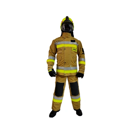 Ubranie zabezpiecza przed działaniem czynników mechanicznych, powierzchniowych, przed środkami chemicznymi, czynnikami atmosferycznymi, wodą, oraz gorącem i płomieniem. Ubranie składa się z kurtki długości 3/4 i spodni wykonanych z tkaniny zewnętrznej w kolorze ciemnogranatowym, czarnym lub PIASKOWYM , tkaniny wodoodpornej (membrany),podszewki i warstwy termoizolacyjnej .