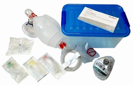- Resuscytator Ambu SPUR II z maską dla dorosłych, rezerwuarem tlenu i drenem do podawania tlenu