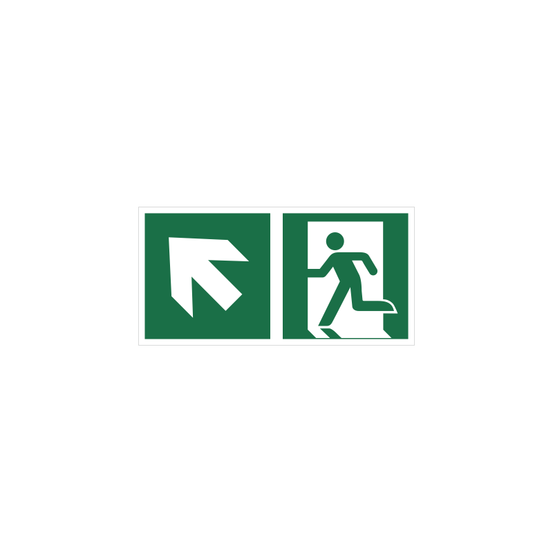Znak łączony wyjście ewakuacyjne ze strzałką po skosie (lewy górny róg) to znak ewakuacyjny zgodny z normą PN-EN ISO 7010. Jest to znak łączony na którym przedstawiono dwa piktogramy - strzałkę skierowaną w kierunku lewego górnego rogu oraz biegnącą postać (skierowaną również w lewą stronę). Znak informuje o kierunku w którym należy zmierzać, by dotrzeć do wyjścia ewakuacyjnego.